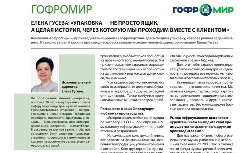Интервью с исполнительным директором Группы компаний Гофромир Еленой Гусевой в журнале "Бизнес-столицы"