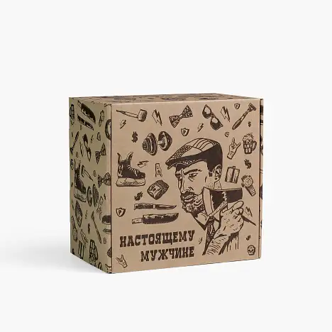 Конструкция коробки — стандартная самосборная FEFCO 0427. Упаковка для подарка сделана в крафтовом стиле. Она подойдет для душевного поздравления с юмором. Принт черного цвета украшает поверхность всей коробки.