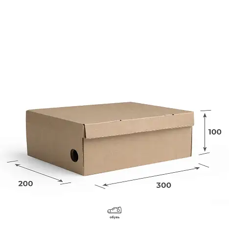 Коробка для обуви 300x200x100 изготовлена из плотного микрогофрокартона марки Т-11 бурого цвета. Модель короба из каталога FEFCO - 0441. Конструкция представляет собой единое полотно, которое собирается в лоток с откидной крышкой. А на боковых стенках вырублены специальные отверстия для циркуляции воздуха. Самосборный гофрокороб очень прочный, но легкий, и способен выдежать значительный вес. К тому же, он выглядит эстетично и отлично держит форму. Такие коробочки используют для упаковки обуви.
