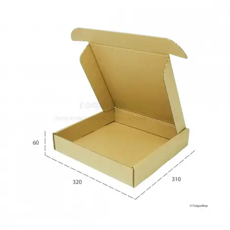 Cамосборный гофрокороб 320x310x60 бурого цвета изготовлен из трехслойного гофрокартона марки Т-23. Имеет профиль В. Такие короба доступны для заказа в белом цвете. Коробка имеет универсальную конструкцию "шкатулка FEFCO 0427" и хорошо держит форму. Такая тара отлично подойдет для упаковки и транспортировки плоских товаров, таких как картины, рамки, зеркала, стекло, настенные часы. Сам короб очень просто собирается по заранее отмеченным на едином гофролисте биговкам.