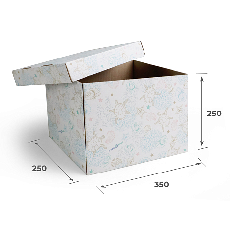 Гофрокороб крышка-дно 350х250х250 изготовлен из трехслойного гофрокатона белого цвета. На изделия нанесена цифровая печать. Модель «крышка-дно», где крышка по каталогу FEFCO 0422, а дно - 0216, очень легкая, компактная и не занимает много места.