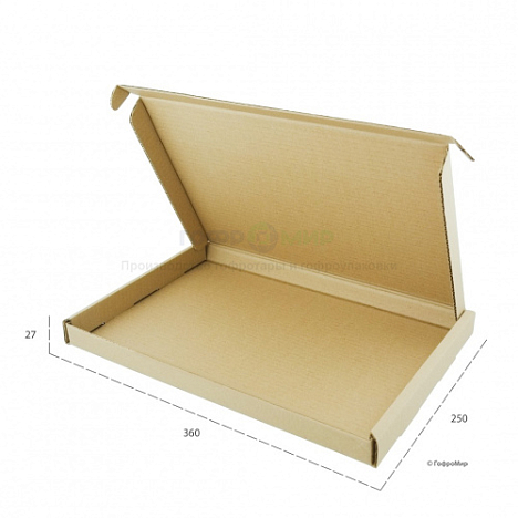 Cамосборный гофрокороб 360x250x27 изготовлен из трехслойного гофрокартона бурого цвета марки Т-11 профиля Е. Характеристики: длина - 360 мм, ширина - 250 мм, высота - 27 мм. Коробка на фото имеет одну из самых популярных конструкций "шкатулка 0427" по международному каталогу упаковок FEFCO. Так как тара не очень высокая, то в нее можно упаковать в основном плоские товары или аксессуары, например, настенные часы, картины, фоторамки, стекло, зеркало, провода, зарядки.