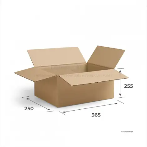 Гофрокороб 4-х клапанный 365х250х255 изготовлен из трехслойного картона бурого цвета марки Т-23. Коробка среднего размера, кратная паллету.