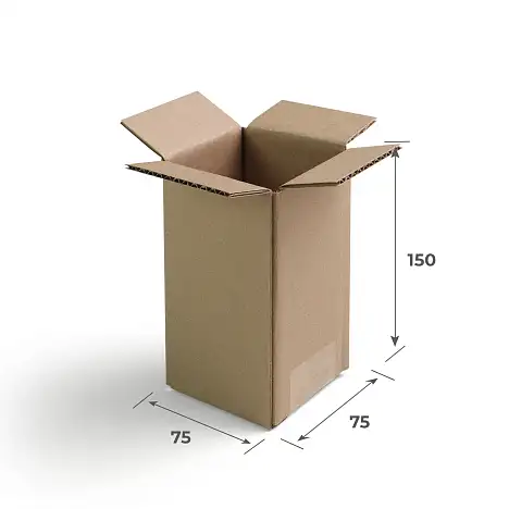 Простой гофрокороб 4-х клапанный 75х75х150 конструкции FEFCO 0201 - это один из самых популярных в мире. Мы изготавливаем картонные коробки как бурого, так и белого цвета.