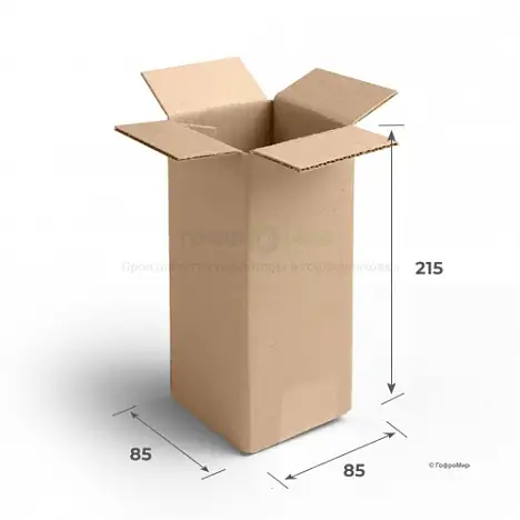 Гофрокороб 4-х клапанный 85х85х215 Эконом — практичная тара, которая может применяться в любой сфере. Собирается и склеивается скотчем за пару минут. Может быть использована для хранения различных товаров или как транспортировочная упаковка.