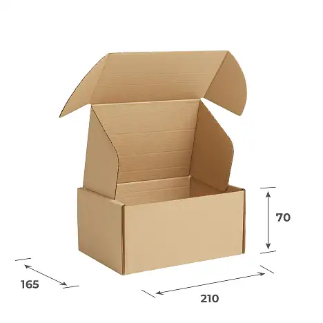 Гофрокороб самосборный 210х165х70 изготовлен из трехслойного микрогофрокартона марки T-23. При необходимости, для клиентов данный короб можем изготовить и в белом цвете.