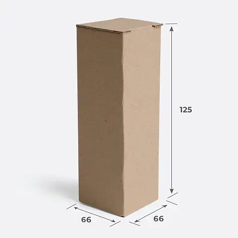 Гофрокороб 66х66х125 представляет собой коробку с цельновысеченной крышкой и отдельным дном-вставкой (тип "ласточкин хвост"). Крышка создает жесткую и устойчивую конструкцию. Такие коробки не требуют склеивания клапанов, легко собираются и часто используются для подарочной, сувенирной продукции и дорогих товаров.