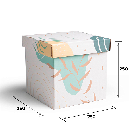 Гофрокороб крышка-дно 250х250х250 изготовлен из трехслойного гофрокатона. На изделия нанесена цифровая печать. Модель «крышка-дно», где крышка по каталогу FEFCO 0422, а дно - 0216, очень легкая, компактная и не занимает много места.