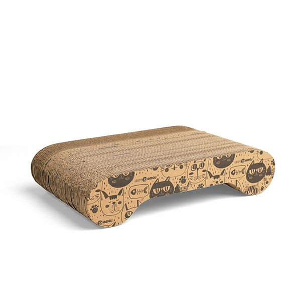 Когтеточка может быть выполнена в форме небольшой картонной лежанки. Кошка сможет как поцарапать об неё коготки, так и просто отдохнуть сверху. Мы выполнили печать на данной конструкции с использованием монохромного изображения, состоящего из мультяшных котов. Такой товар на полках магазина заинтересует покупателя своей забавностью.